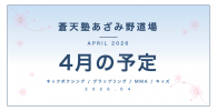 蒼天塾あざみ野道場10月の予定 【休館日】 10/13(月祝) 【時間変更】 10/5(日) 担当:兵庫 12:00~12:50 キックボクシング(初心者) 13:00~14:15 キックボクシング(対人練習) 14:3 …